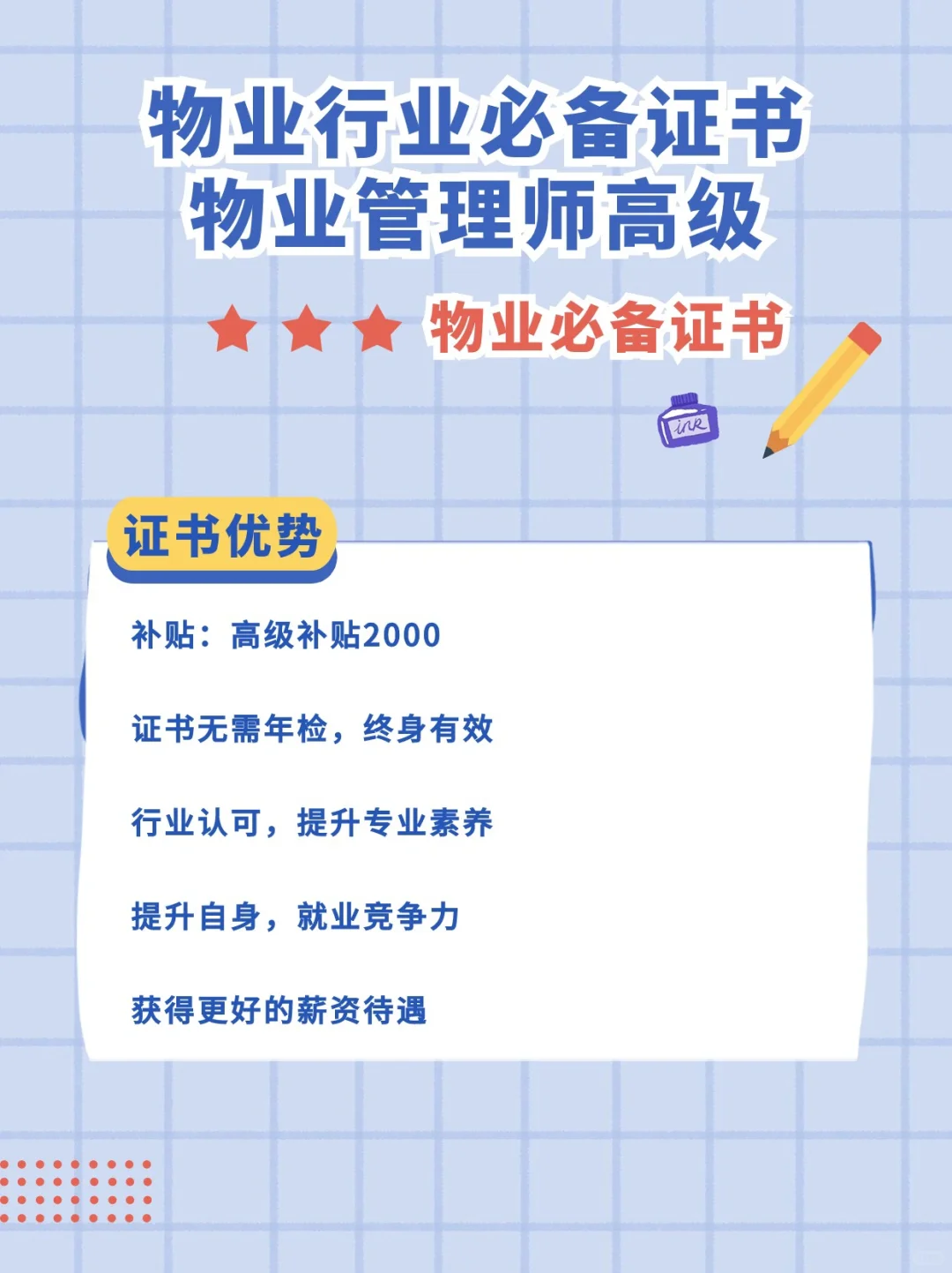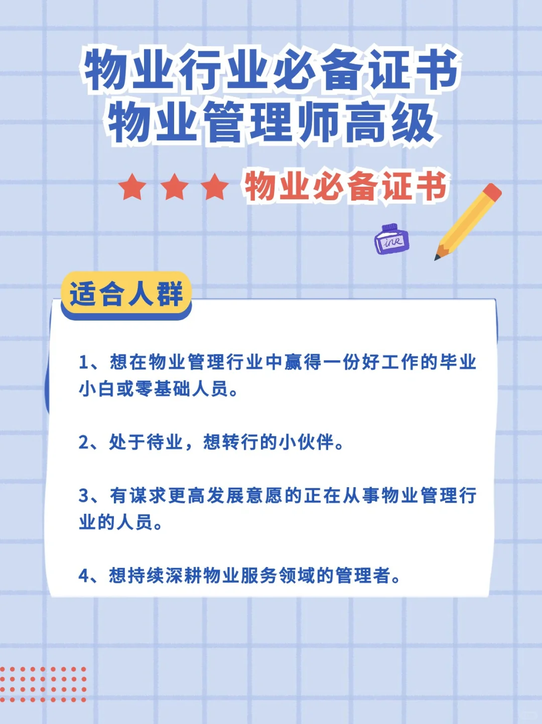 社会工作等相关专业的学生:这些学生可以通过考取物业管理师证书来提升自己在社区管理和服务方面的专业能力;
